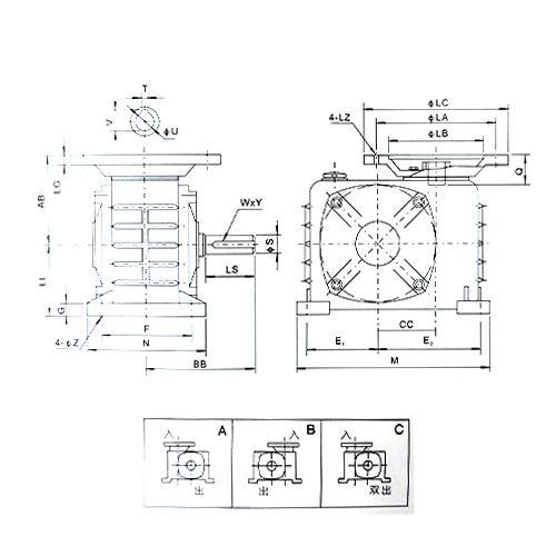 | 型号 Size | 入功率 Input(kw) | 传动比 Ratio | AB | LL | BB | CC | E1 | E2 | F | G | M | N | Z | 电机法兰Flange | 入力孔Input Hole | 输出轴Output shaft | 重量 KG | ||||||||